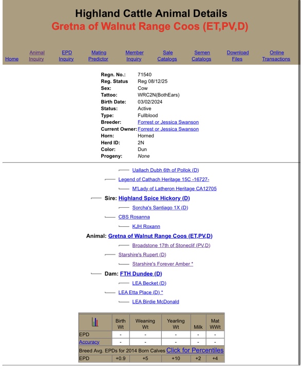 Pedigree: Dam: FTH Dundee (51,836). Sire: Highland Spice Hickory (59,533)